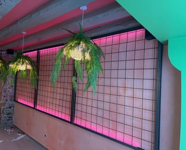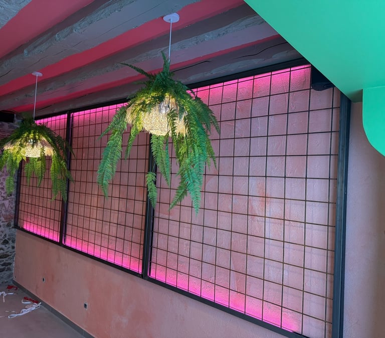 Nous avons réalisé l'aménagement d'un restaurant en créant des structures murales sur mesure en grilles de fer à béton.